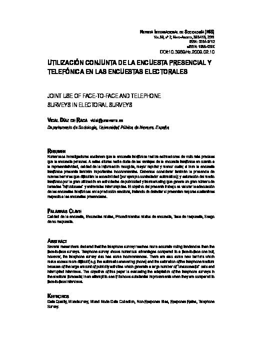 Díaz, V. (2011). Utilización conjunta de la encuesta presencial y telefónica en las encuestas electorales. Revista Internacional de Sociología, 69 (2), pp. 393-416