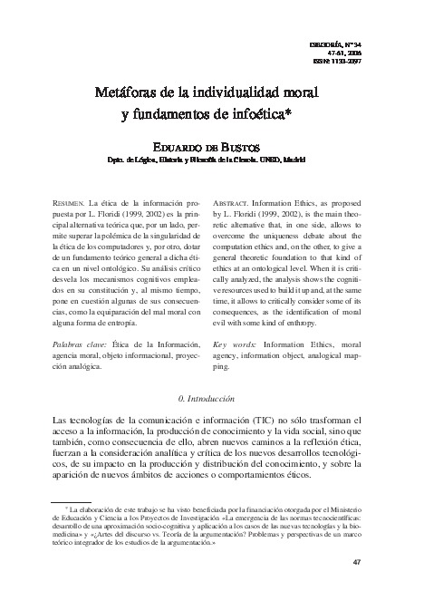 De Bustos, E. (2005). Metáforas de la individualidad moral y fundamentos de infoética. Isegoría, (34), pp. 47-61