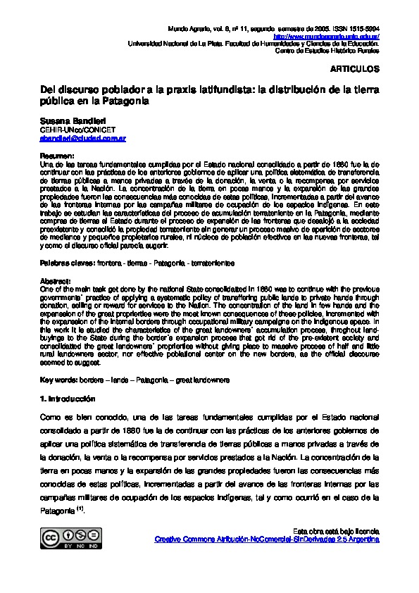 Bandieri, S. (2005). Del discurso poblador a la praxis latifundista: la distribución de la tierra pública en la Patagonia. Mundo Agrario, 6 (11), pp. 1-19.