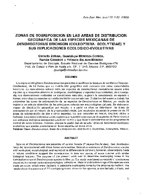 Zúñiga Bermúdez, G. (1999). Zonas de sobreposición en las áreas de distribución geográfica de las especies mexicanas de Dentroctonus, Erichson, (coleóptera: Scolytidae) y sus implicaciones ecológico-evolutivas. Acta Zoológica Mexicana, 77, pp. 1-22.