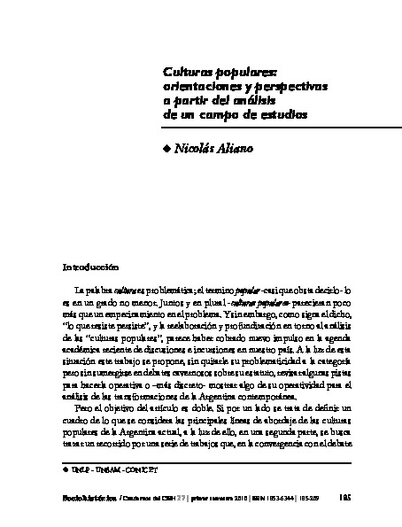 Aliano, N. (2010). Culturas populares: Orientaciones y perspectivas a partir del análisis de un campo de estudios. Sociohistórica. Cuadernos del CISH, (27), pp. 1-25.