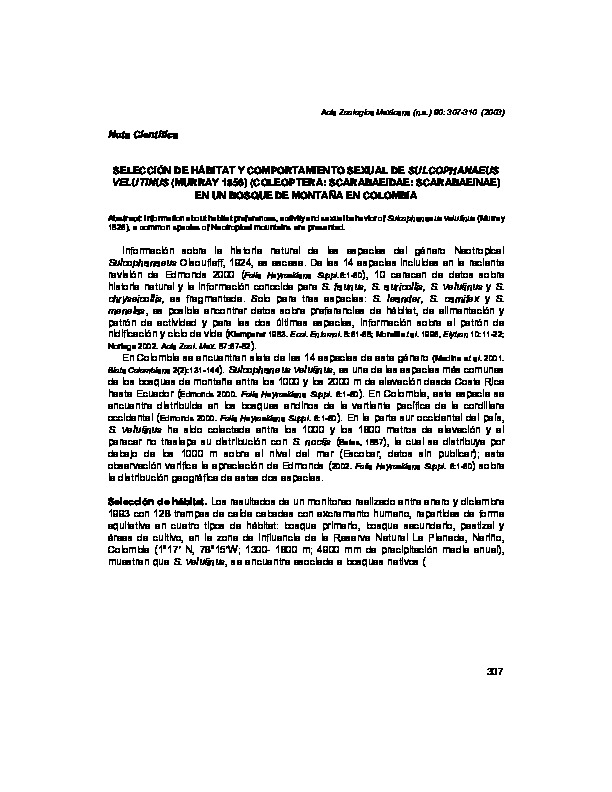 Información sobre las preferencias de hábitat, actividad y comportamiento sexual de Sulcophanaeus velutinus (Murray 1826), una especie común de montañas neotropicales se presentan.