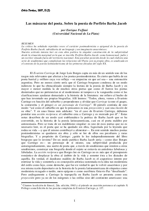 Foffani, E. (1997). Las máscaras del poeta. Sobre la poesía de Porfirio Barba Jacob. Orbis Tertius, nro. 5, pp. 1-8.