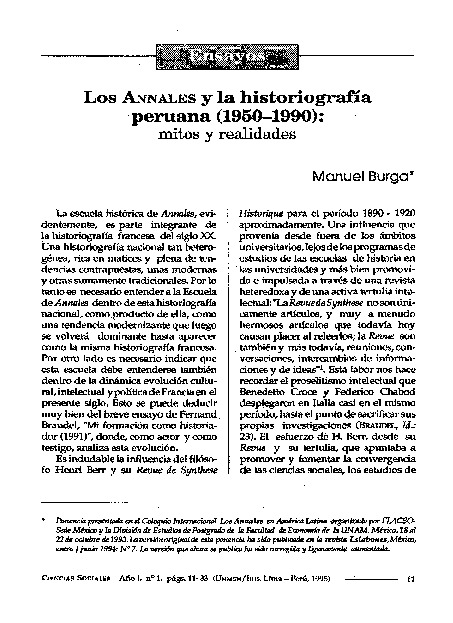Burga Díaz, M. (1995). Los Annales y la historiografía peruana (1950 - 1990): mitos y realidades. Investigaciones Sociales, 1 (1), pp. 1-23.