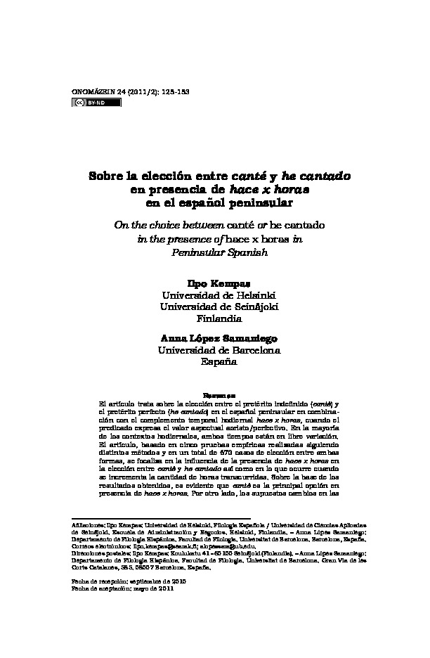Kempas, I. & López Samaniego, A. (2011). Sobre la elección entre canté y he cantado en presencia de hace x horas en el español peninsular. Onomázein, nro. 24, pp. 125-153.
