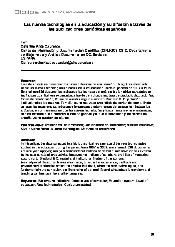 Anta Cabreros, C. (2004). Las nuevas tecnologías en la educación y su difusión a través de las publicaciones periódicas españolas. Biblios, nro. 18-19, pp. 1-11.