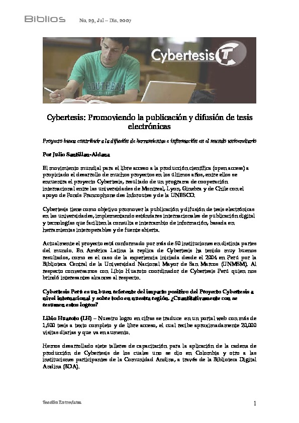Santillán Aldana, J. (2007). Cybertesis: promoviendo la publicación y difusión de tesis electrónicas. Biblios, nro. 28, pp. 1-4.