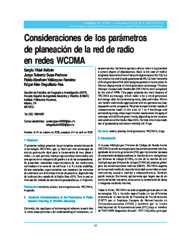 Vidal Beltrán, S. et al. (2010). Consideraciones de los parámetros de planeación de la red de radio en redes WCDMA. Científica: La Revista Mexicana de Ingeniería Electromecánica, 14(1), pp. 25-31.