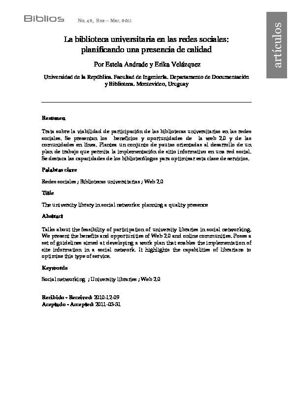 Andrade, E. & Velázquez, E. (2011). La biblioteca universitaria en las redes sociales: planificando una presencia de calidad. Biblios, nro. 42, pp. 36-46.