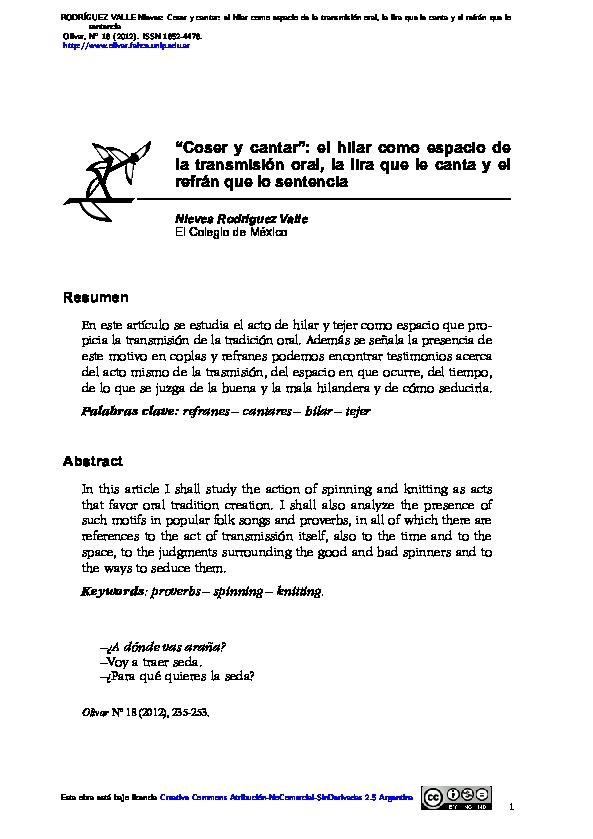 Rodríguez Valle, N. (2012). “Coser y cantar”: el hilar como espacio de la transmisión oral, la lira que le canta y el refrán que lo sentencia. Olivar, 13 (18), pp. 235-253.