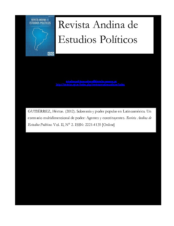 Gutiérrez Magaña, H. M. (2012). Soberanía y poder popular en Latinoamérica. Un escenario multidimensional de poder: agentes y constituyentes. Revista Andina de Estudios Políticos, 2(2), pp. 7-27.