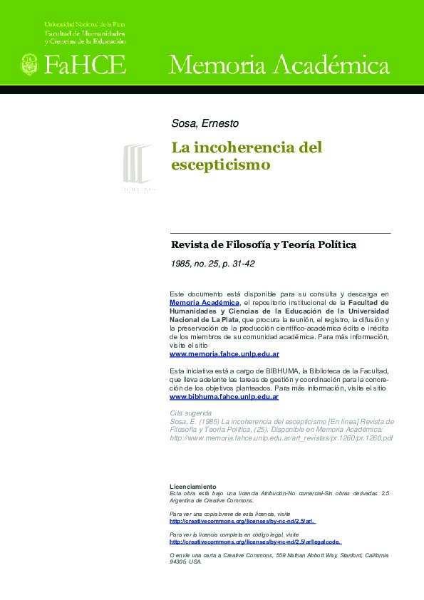 Sosa, E. (1985). La incoherencia del escepticismo. Revista de filosofía y teoría política, nro. 25, pp. 31-42.