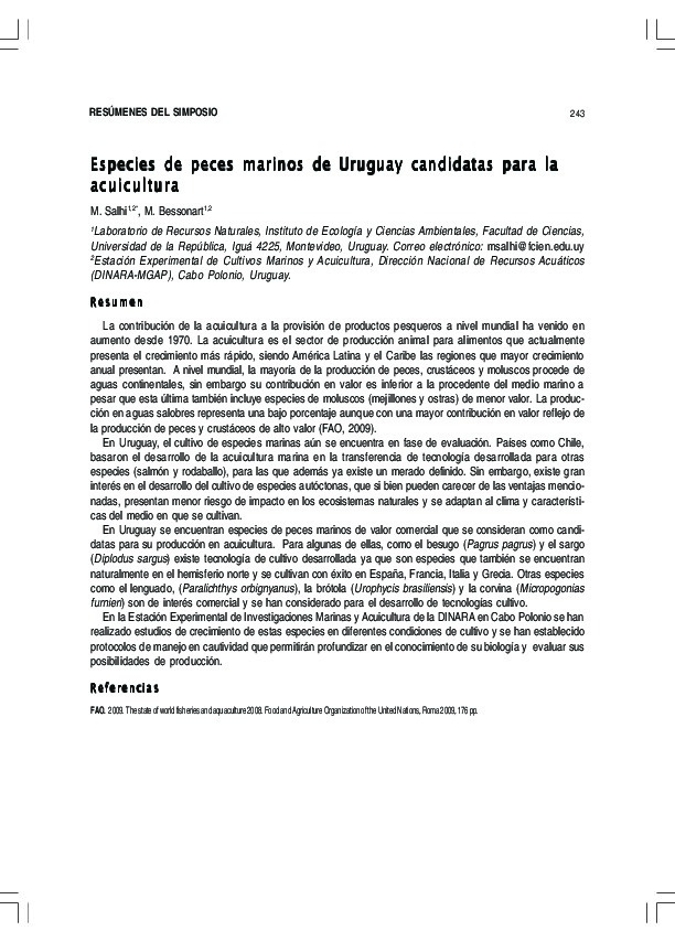 M. Salhi, M. Bessonart (2010). Especies de peces marinos de Uruguay candidatas para la acuicultura. Agrociencia, 14(3), pp. 242.