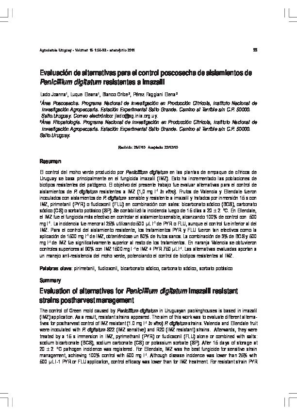 Lado, J. et al. (2011). Evaluación de alternativas para el control poscosecha de aislamientos de Penicillium digitatum resistentes a imazalil. Agrociencia, 15(1), pp. 55-63.