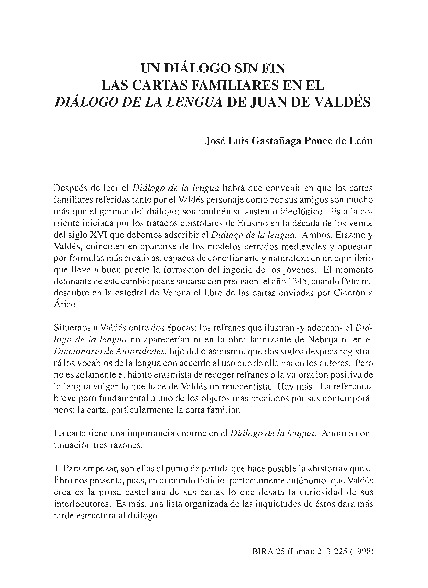 Gastañaga, J. (1998). Un diálogo sin fin. Las cartas familiares en el Diálogo de la lengua de Juan de Valdés. Boletín del Instituto Riva Agüero, Nro. 25, pp. 213-225.