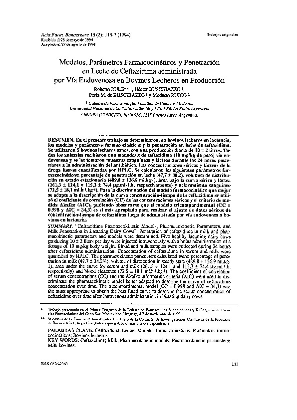 Buschiazzo, P. et al. (1994). Modelos, parámetros farmacocinéticos y penetración en leche de Ceftazidima administrada por vía endovenosa en bovinos lecheros en producción. Acta Farmacéutica Bonaerense, 13 (2), pp. 113-117.