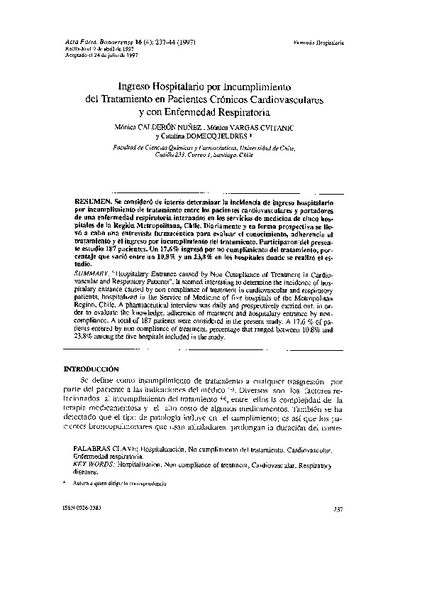 Calderón, M. et al. (1997). Ingreso hospitalario por incumplimiento del tratamiento en pacientes crónicos cardiovasculares y con enfermedad respiratoria. Acta Farmacéutica Bonaerense, 16 (4), pp. 245-249.