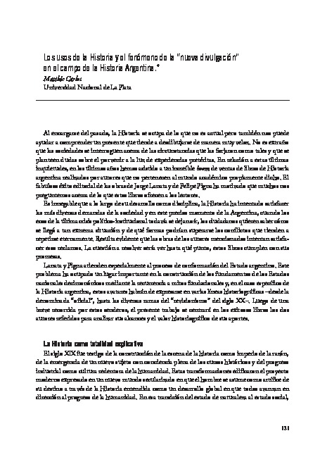Carlos, M. (2006). Los usos de la historia y el fenómeno de la nueva divulgación en el campo de la historia argentina. Clío & Asociados, (9-10), pp. 131-148.