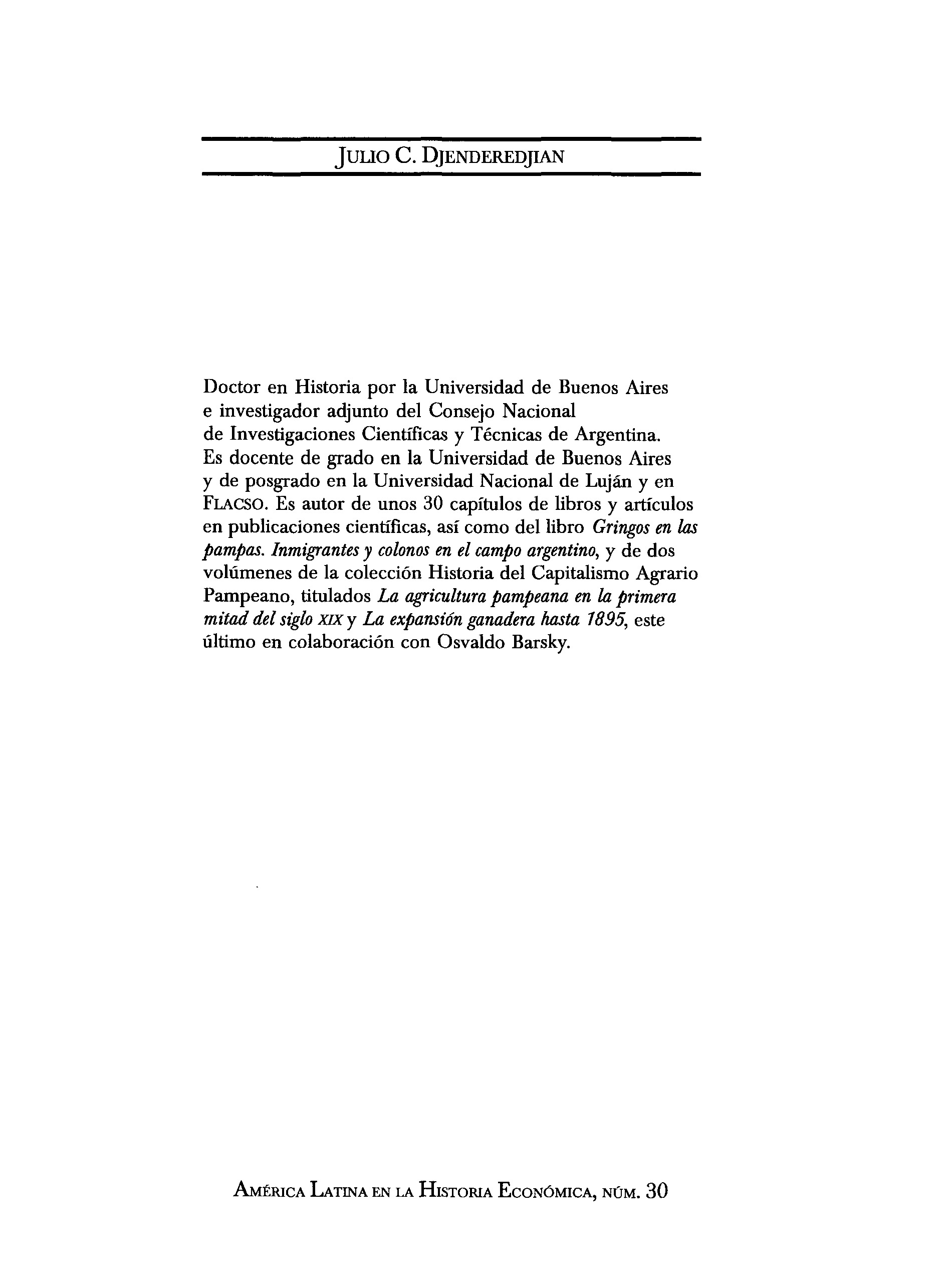 Djenderedjian, J. (2008). La colonización agrícola en Argentina, 1850-1900: Problemas y desafíos de un complejo proceso de cambio productivo en Santa Fe. América Latina en la Historia Económica, 15 (2), pp. 129-157.