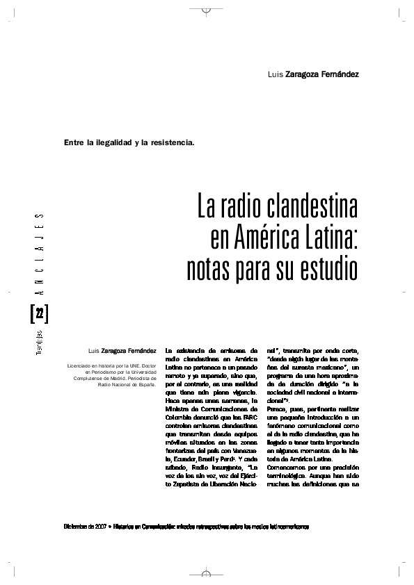 Zaragoza, L. (2008). La radio clandestina en América Latina: notas para su estudio. Tram[p]as de la Comunicación y la Cultura, (59), pp. 22-25