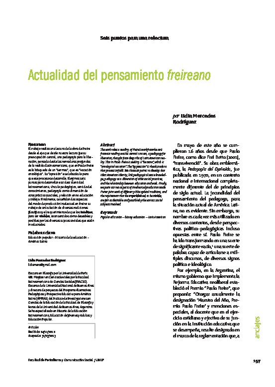 El trabajo realiza una lectura de la obra de Freire desde el eje que desde nuestra lectura fue su preocupación central, una pedagogía para la liberación, pensada desde las nervaduras profundas de la realidad latinoamericana, que en Paulo Freire es la búsqueda de un “ser mas”, que es “vocación ontológica”. La “opresión” es el obstáculo para que ese proceso se desarrolle. Elegimos seis puntos para desarrollar esa idea: identidad latinoamericana, vínculo pedagógico, sentido del conocimiento, pedagogía como dimensión de otras prácticas sociales, y relación entre educación y trabajo. Finalmente, se señalan dos aspectos del modo de producción intelectual en Freire: su trabajo de articulación de diversas tradiciones filosóficas y el requerimiento de que los inéditos, para ser viables, sean sentidos como deseables y posibles por los diversos sujetos sociales que están involucrados.