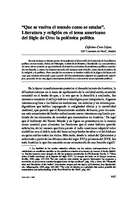 Caro, C. (1999). “Que se vuelva el mundo como se estaba”. Literatura y religión en el tema americano del Siglo de Oro: la polémica política. Anuario de Estudios Americanos, 56 (2), pp. 441-462.