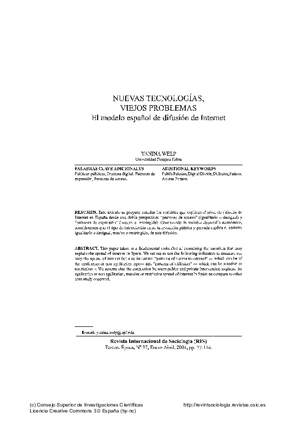 Welp, Y. (2004). Nuevas tecnologías, viejos problemas. El modelo español de difusión de Internet. Revista Internacional de Sociología, 62 (37), pp. 77-114.
