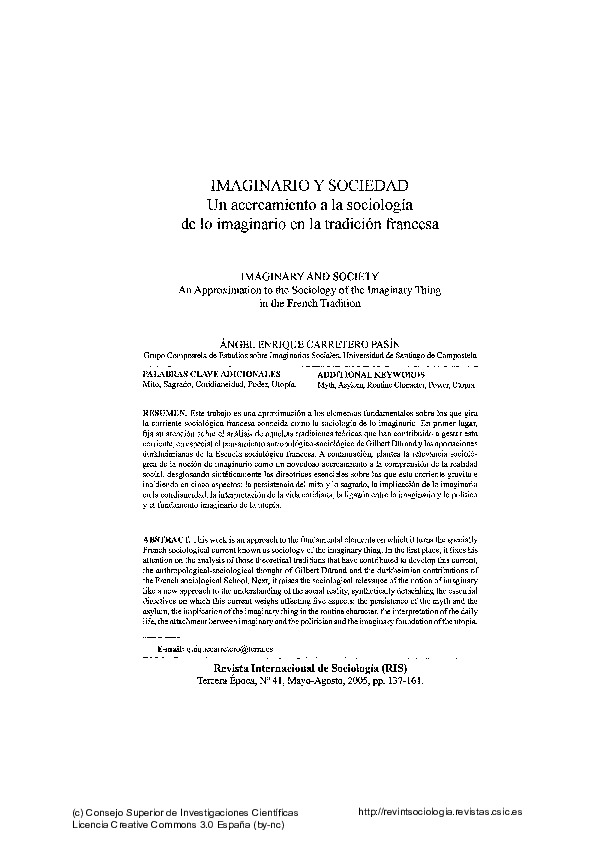 Carretero, A. (2005). Imaginario y Sociedad. Un acercamiento a la sociología de lo imaginario en la tradición francesa. Revista Internacional de Sociología, 63 (41), pp. 137-161.