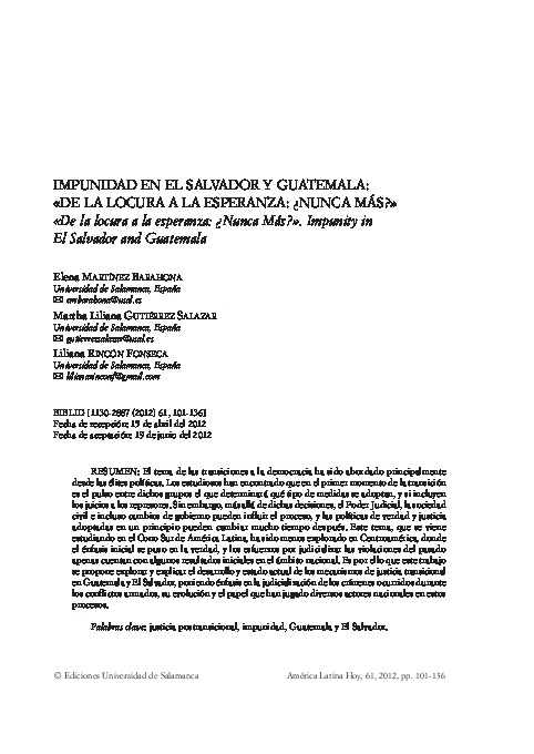 Martínez Barahona, E. & Gutiérrez Salazar, M. L. & Rincón Fonseca, L. (2012). Impunidad en El Salvador y Guatemala: «de la locura a la esperanza: ¿nunca más?». América Latina Hoy, 61, pp.101-136.