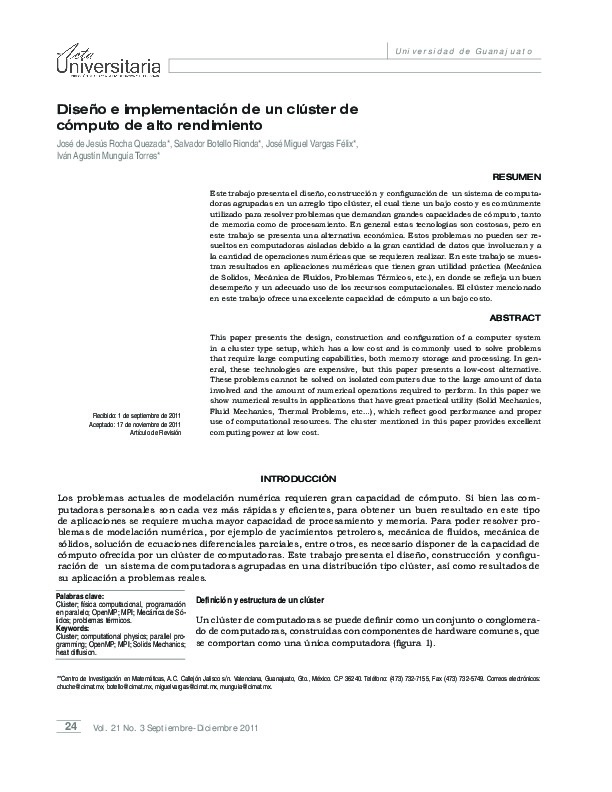 Rocha Quezada, J. et al. (2011). Diseño e implementación de un clúster de cómputo de alto rendimiento. Acta Universitaria, 21 (3), pp. 24-33.