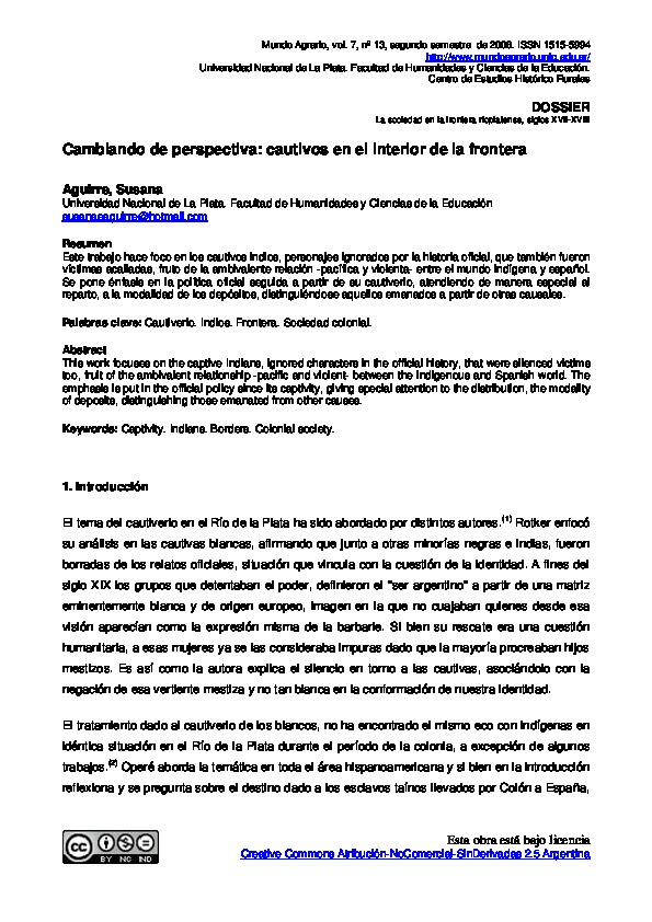 Aguirre, S. (2006). Cambiando de perspectiva: cautivos en el interior de la frontera. Mundo Agrario, 7 (13), pp. 1-15.