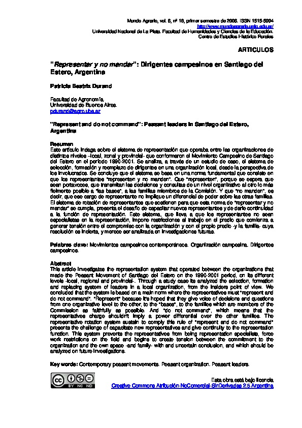 Durand, P. (2008). "Representar y no mandar": Dirigentes campesinos en Santiago del Estero, Argentina. Mundo Agrario, 8 (16), pp. 1-12.