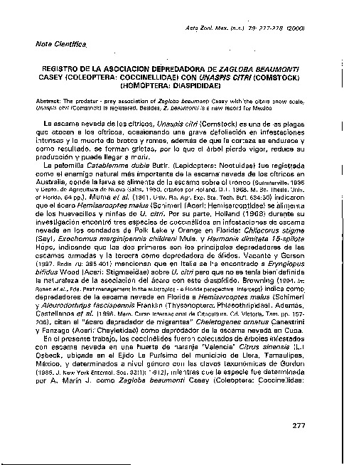 Coronado Blanco J.M., Ruíz-Cancino, E. & Marín Jarillo, A. (2000). Registro de la asociación depredadora de zagloba beaumonti casey (coleoptera: coccinellldae) con unaspis citri (comstock) (homoptera: diaspididae). Acta Zoológica Mexicana, 79, pp. 277-278.