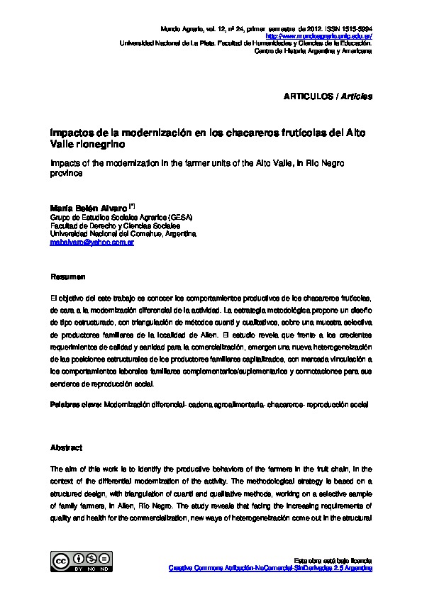 Alvaro, M. (2012). Impactos de la modernización en los chacareros frutícolas del Alto Valle rionegrino. Mundo Agrario, 12 (24), pp. 1-38.