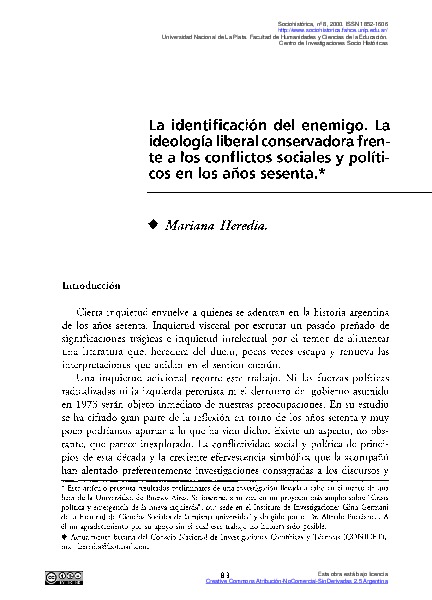 Heredia, M. (2000). La identificación del enemigo. La ideología liberal conservadora frente a los conflictos sociales y políticos en los años sesenta. Sociohistórica. Cuadernos del CISH, (8), pp. 1-38.