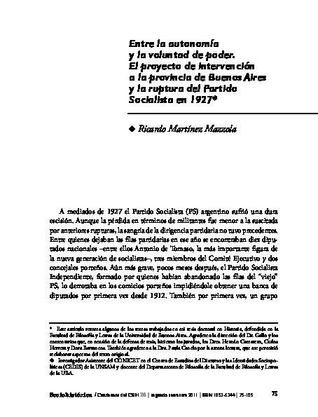 Martínez Mazzola, R. (2011). Entre la autonomía y la voluntad de poder: El proyecto de intervención a la provincia de Buenos Aires y la ruptura del Partido Socialista en 1927. Sociohistórica. Cuadernos del CISH, (28), pp. 1-31.