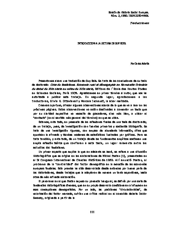 Presentamos ahora una traducción de Guy Bois. Se trata de las conclusiones de su tesis de doctorado: Crise du feodalisme. Economie rural et dèmographie en Normandie Orientale du debut du XlVe siecle au milieu du XVIe siecle, Editions de l´Ecole des Hautes Etudes en Sciences Sociales, París 1976. Agradecemos en primer término al autor, que nos ha autorizado a publicar este trabajo. En segundo lugar, agradecemos a las traductoras, Si lvia E. Ottavianelli y Marcela Inchausti, la labor realizada. Creemos oportuno, ofrecer algunas observaciones acerca de lo que se va a leer en las próximas páginas. Estas observaciones no están destinadas a comentar un texto que por su claridad expositiva no necesita de glosadores, sino más bien, a ubicar el "contexto" (en el sentido más general del término) en que se ubica.