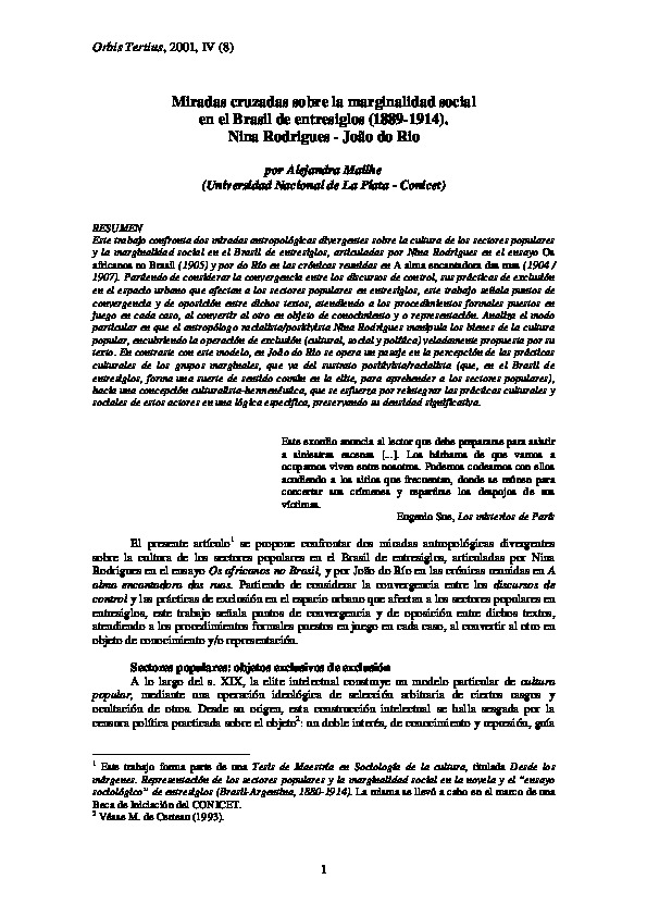 Mailhe, A. (2001). Miradas cruzadas sobre la marginalidad social en el Brasil de entresiglos (1889-1914). Nina Rodrigues - João do Rio. Orbis Tertius, nro. 8, pp. 1-12.