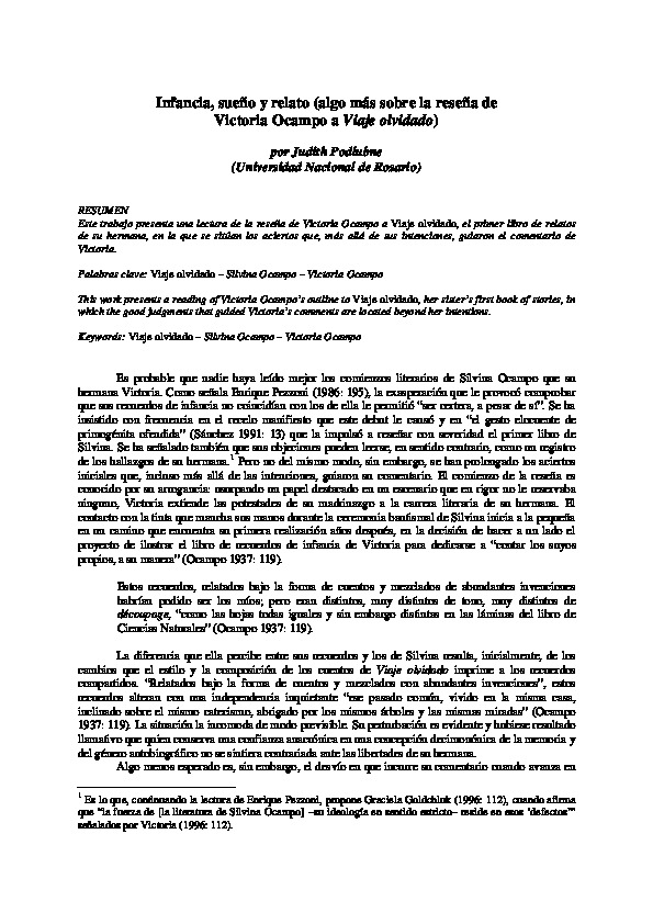 Podlubne, J. (2006). Infancia, sueño y relato (algo más sobre la reseña de Victoria Ocampo a Viaje olvidado). Orbis Tertius, nro. 12, pp. 1-7.