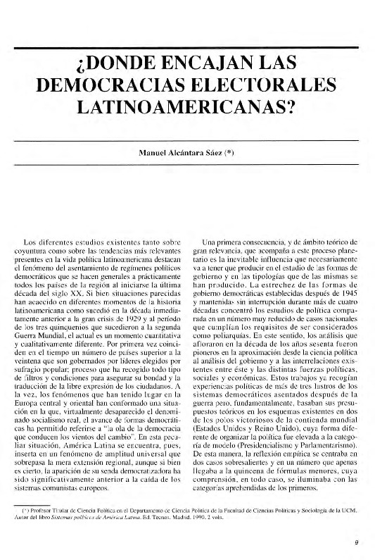 El autor destaca la dificultad existente a la hora de establecer tipologías en las que puedan enouadrarse los . actuales sistemas democráticos latinoamericanos. Las elecciones realizadas durante la década de los años 80 han probado que se trata de sistemas que funcionan correctamente desde el punto de vista formal, aunque tienen serias dificultades para resolver problemas que afectan a su eficacia y que por consiguiente lastran su consolidación.