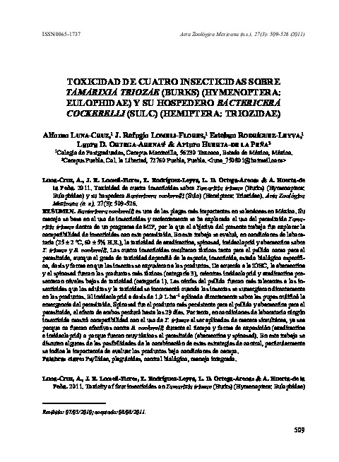 Luna-Cruz, A. et al. (2011). Toxicidad de cuatro insecticidas sobre tamarixia triozae (burks) (hymenoptera: eulophidae) y su hospedero bactericera cockerelli (sulc) (hemiptera: triozidae). Acta Zoológica Mexicana, 27(3), pp. 509-526.