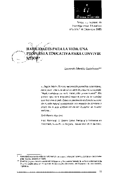 Mantilla Castellanos, L. (2005). Habilidades para la vida. Una propuesta educativa para convivir mejor. Investigación Educativa, 9 (16), pp. 1-13.