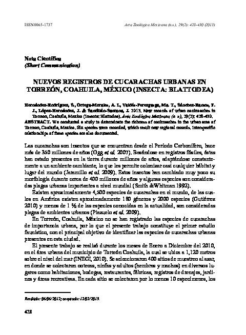 Hernández-Rodríguez, S. et al. (2013). Nuevos registros de cucarachas urbanas en Torreón, Coahuila, México (Insecta: Blattodea). Acta Zoológica Mexicana, 29(2), pp.423-427.