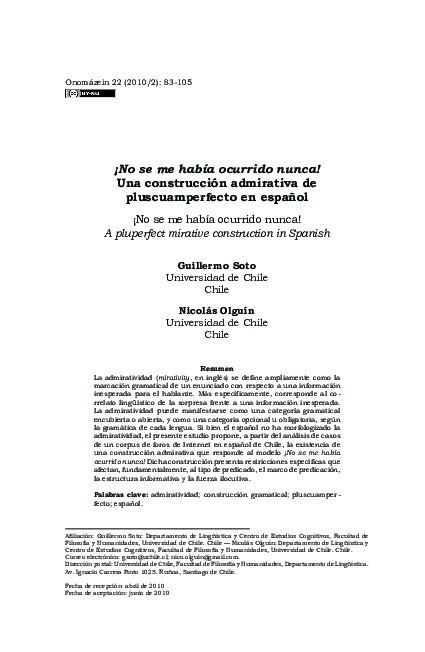 Soto, G. & Olguín, N. (2010). ¡No se me había ocurrido nunca! Una construcción admirativa de pluscuamperfecto en español. Onomázein, nro. 22, pp. 83-105.