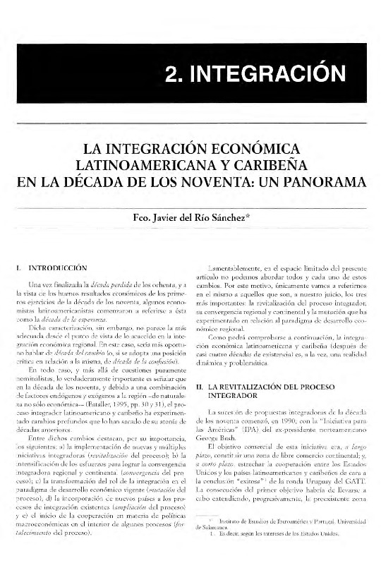 latinoamericano y caribeño, a lo largo de la década de los noventa, así como sus implicaciones para la economía regional. El autor focaliza su análisis en tres aspectos que caracterizan esa evolución: la revitalización del proceso de integración a nivel continental, la convergencia entre diferentes espacios económicos y la incidencia de estos aspectos en el modelo de desarrollo regional. Palabras clave: Integración Económica - Revitalización Integradora Convergencia Integración - América Latina y el Caribe.