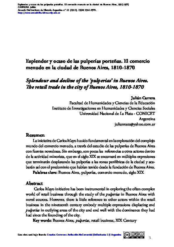 Carrera, J. (2012). Esplendor y ocaso de las pulperías porteñas. El comercio menudo en la ciudad de Buenos Aires, 1810-1870. Anuario del Instituto de Historia Argentina, nro. 12, pp. 173-198.