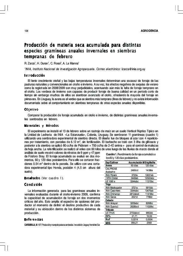 Zarza, R. et al. (2010). Producción de materia seca acumulada para distintas especies gramíneas anuales invernales en siembras tempranas de febrero.Agrociencia, 14(3), pp. 138.