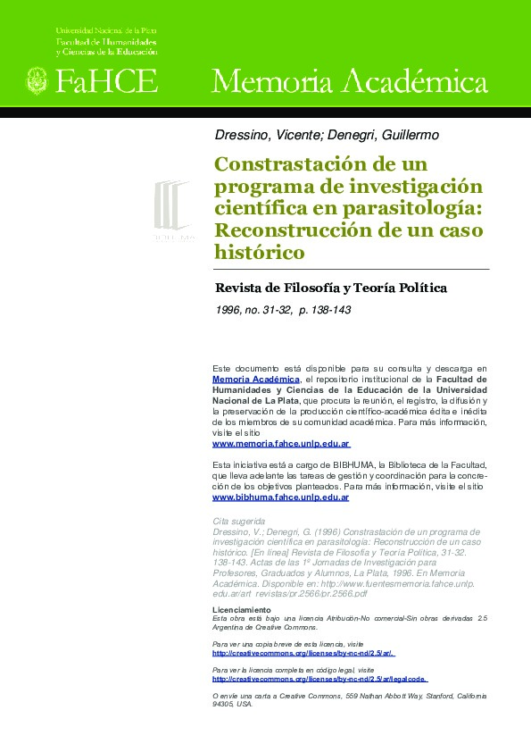 Dressino, V. & Denegri, G. (1996). Constrastación de un programa de investigación científica en parasitología: reconstrucción de un caso histórico. Revista de Filosofía y Teoría Política, (31-32), pp. 138-143.