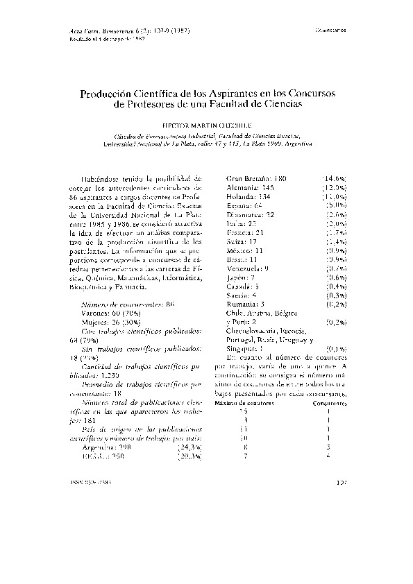 Habiéndose tenido la posibilidad de cotejar los antecedentes curriculares de 86 aspirantes a cargos docentes de Profesores en la Facultad de Ciencias Exactas de la Universidad Nacional de La Plata entre 1985 y 1986, se consideró atractiva la idea de efectuar un análisis comparativo de la producción científica de los postulantes. La información que se proporciona corresponde a concursos de cátedras pertenecientes a las carreras de Física, Química, Matemáticas, Informática, Bioquímica y Farmacia.