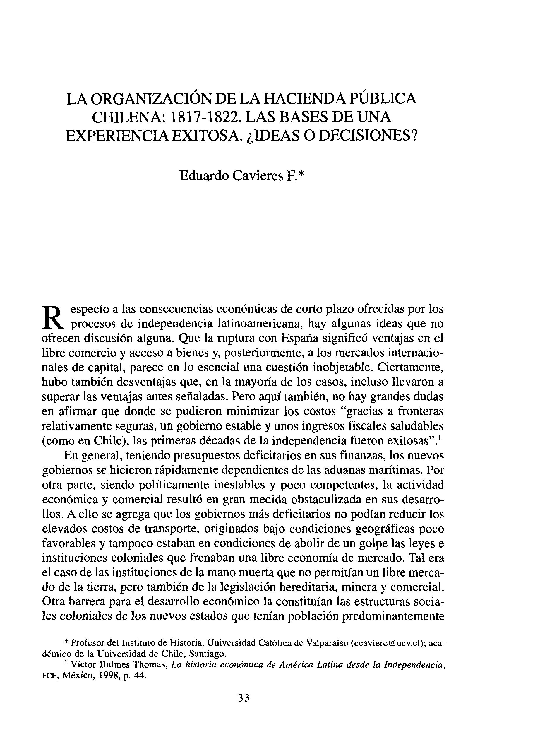 Cavieres Figueroa, E. (2000). La organización de la Hacienda pública chilena: 1817-1822. Las bases de una experiencia exitosa. ¿Ideas o decisiones?. América Latina en la Historia Económica, 7 (13/14), pp. 33-49.